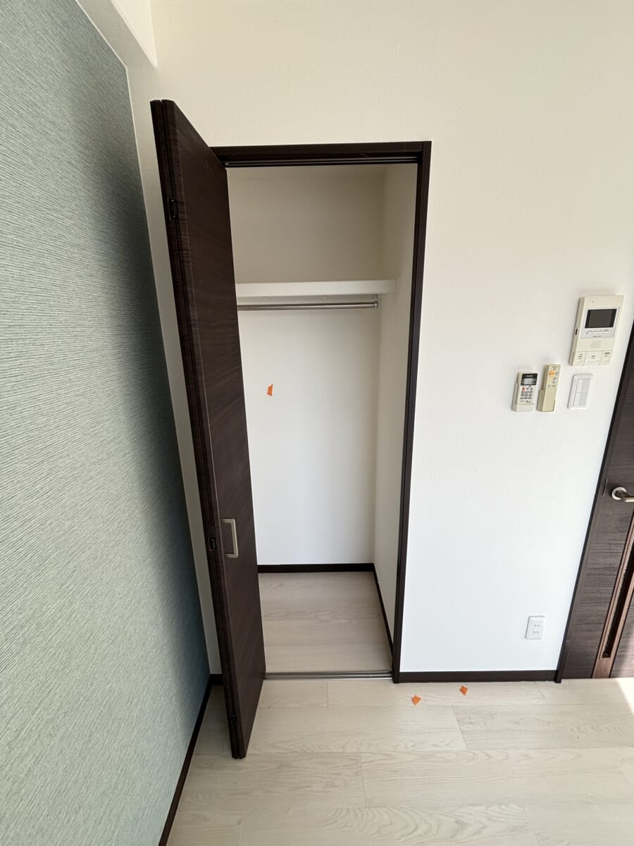 洋室には、衣類や大きな荷物を効率よく収められるクローゼットが完備されています。ハンガーパイプを利用すれば、コートやスーツなどのシワをつけたくない衣類を吊るして保管でき、下のスペースには衣装ケースや小物も置けます。