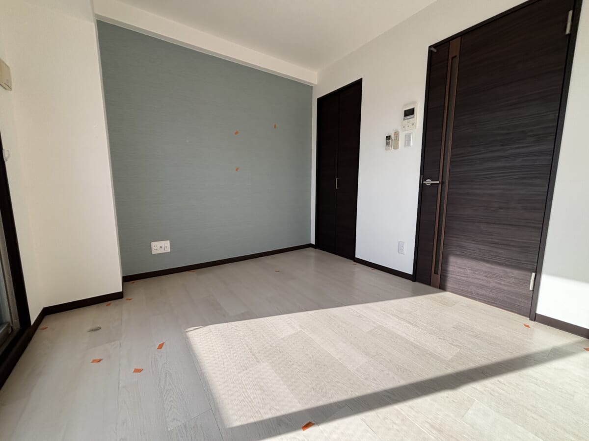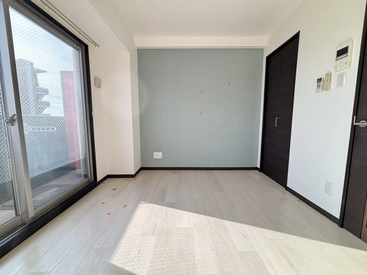 広さは、家具の配置がしやすい約6畳です。このお部屋の最大の魅力は、南向きで9階建ての6階という立地!日当たりが非常に良く、洗濯物がよく乾くのはもちろん、冬場も暖かく過ごしやすいのが嬉しいポイントです。