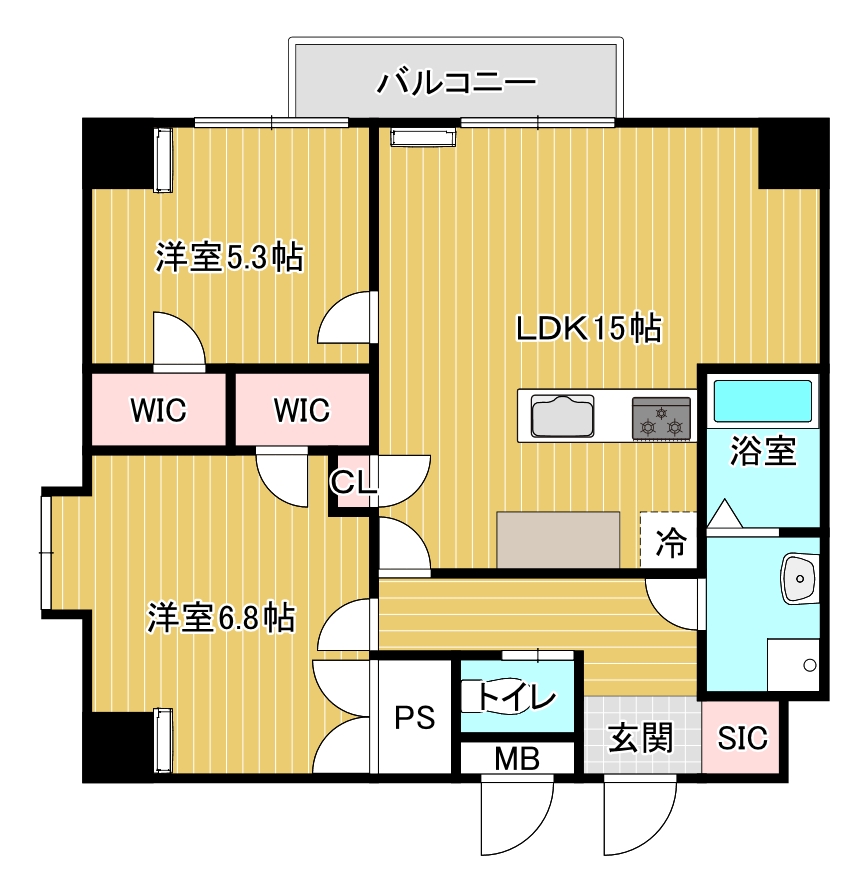 リビングダイニングは広々とした15帖。対面式キッチンを見渡す開放的な空間です。洋室は6.8帖と5.3帖の2部屋あり、寝室や趣味の部屋、書斎など多様な使い方が可能です。