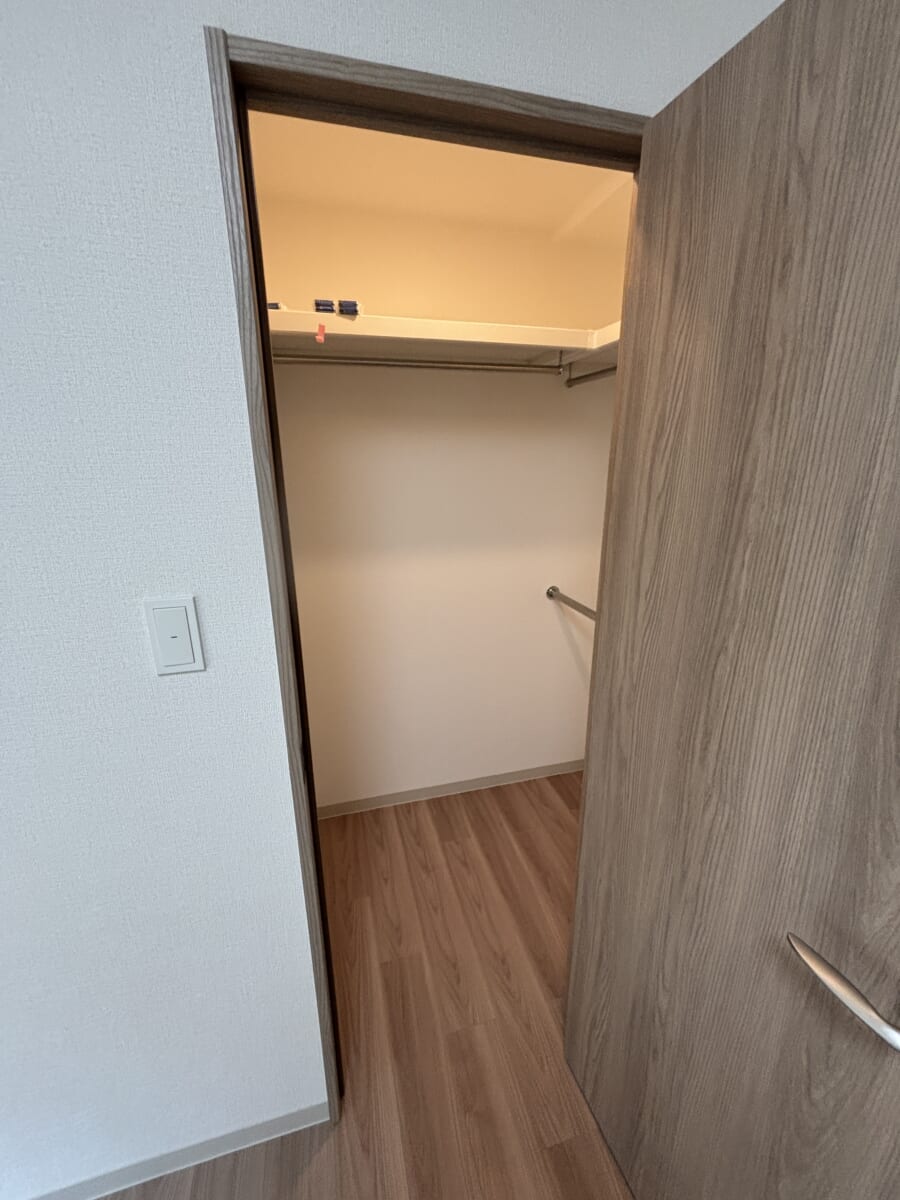 【LEGALAND+ABENO SANMEICHO】では、衣類が多い方も安心のウォークインクローゼット(WIC)を洋室の一つに完備。季節の衣類やスーツケース、かさばる日用品もまとめて収納でき、居室空間を最大限広く使えます。