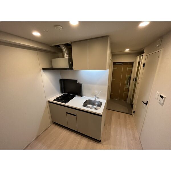 新築ならではのシステムキッチンは、スタイリッシュな面材で仕上げられ、お部屋のモダンな雰囲気を損ないません。2口のガスコンロを搭載しており、忙しい合間のクイックな料理から本格的なメニューまでストレスなくこなせます。