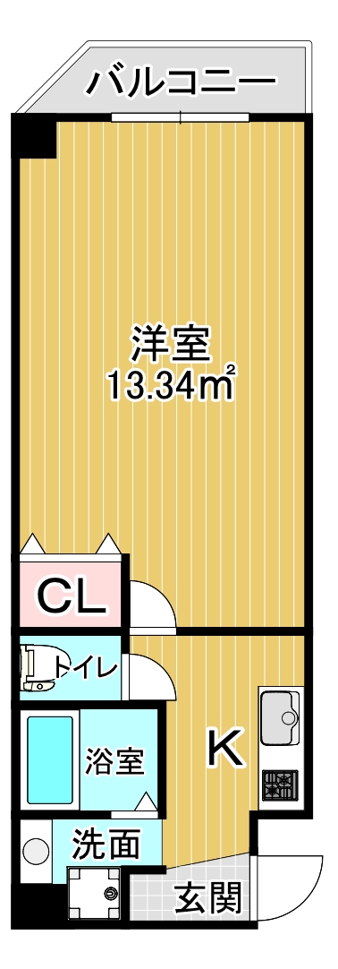 無駄のない長方形の居室は、窓が一角にまとまっているため壁面が広く、棚やデスクを配置しやすい機能的な間取りです。キッチンと居室を分ける扉があることで、料理の匂い移りも防げ、生活にメリハリが生まれます。玄関からお部屋の中が直接見えにくい構造も、一人暮らしには嬉しいポイント。コンパクトながらも生活動線が計算された、落ち着いて暮らせる単身者向けのお部屋です。