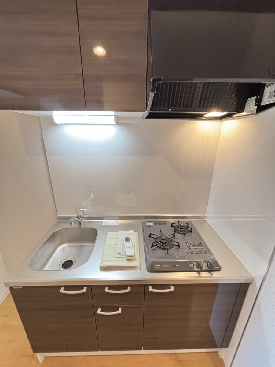 居室とキッチンスペースが扉でしっかりと仕切られている「1K」スタイルの構造です。ワンルームにありがちな「寝室に料理の匂いがこもる」という悩みを解消し、快適な住環境を保てます。キッチン周りは無駄のないコンパクトな動線で設計されており、調理から片付けまでスムーズにこなせるのが魅力。一人暮らしにちょうどいいサイズ感で、毎日のお料理も手際よく楽しめます。