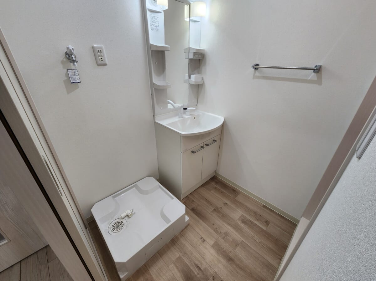 また、洗濯機置き場を併設した脱衣スペースは、着替えや家事動線をスムーズにする十分な広さを確保。白を基調とした内装に、高級感のある木目調の洗面台が映える洗練されたデザインに仕上がっています。床面にはお手入れのしやすいクッションフロアを採用しており、水回りの清潔感を常にキープ。新築ならではの最新設備が整った、日々の暮らしにゆとりと心地よさを与えてくれる空間です。