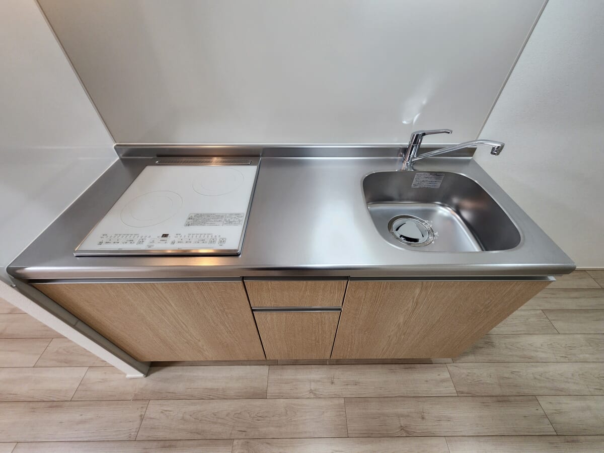 自炊が楽しくなる、機能性とデザイン性を兼ね備えたシステムキッチンです。写真でも目を引くのは、清潔感あふれるホワイトのパネルと、広々とした作業スペース。2口ガスコンロを完備しており、効率よくお料理を楽しめます。キッチン上下には、調理器具や食器、ストック食材をたっぷり収納できる扉付きのキャビネットが備わっており、生活感が出やすい水回りも常にすっきりと保つことが可能です。