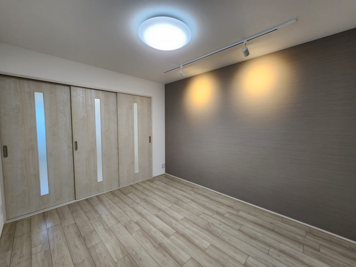 白を基調とした内装に、質感の良いアクセントクロスが映える、写真通りのスタイリッシュな空間です。最大の魅力は、リビングと洋室を仕切る「3枚構成の可動間仕切り」が生み出す圧倒的な開放感。扉を端に寄せることで、壁の大部分が取り払われたような広い開口部が現れ、リビングと洋室が境目なくダイナミックに繋がります。