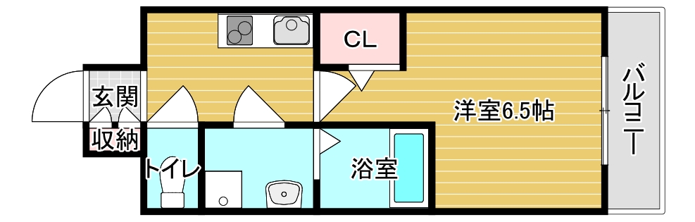 奥行きが控えめな分、その分が居室(洋室)の有効スペースとして還元されているのがこの間取りのポイント。クローゼットの扉が部屋に大きく干渉しないため、近くまで家具を寄せやすく、6.5帖という広さを最大限に活用できるレイアウトになっています。