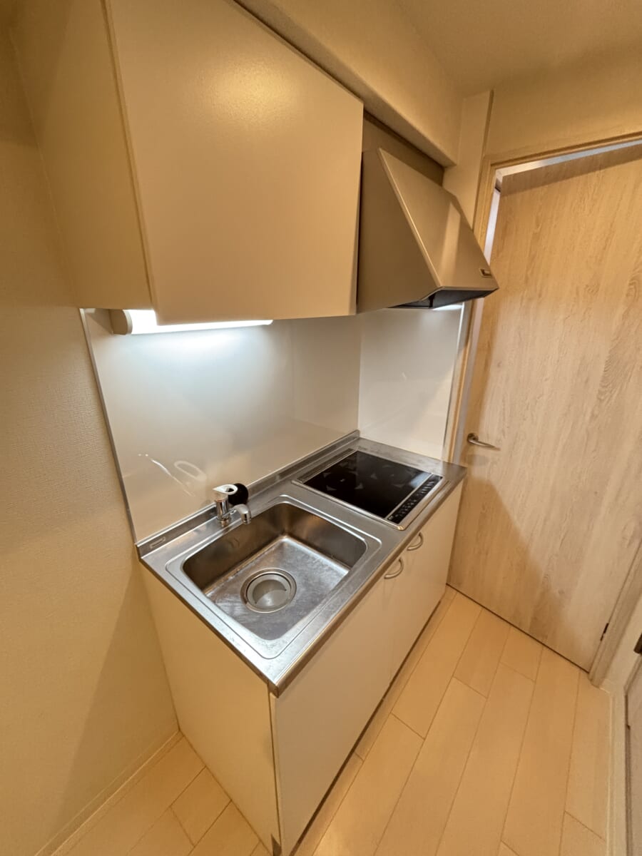 また、キッチンの上下には収納スペースもしっかり確保。一人暮らし用の食器や調理器具、調味料などをすっきりと整理できます。背後には冷蔵庫を置くスペースもあらかじめ計算されており、調理中の動線が非常にコンパクトで使い勝手抜群です。