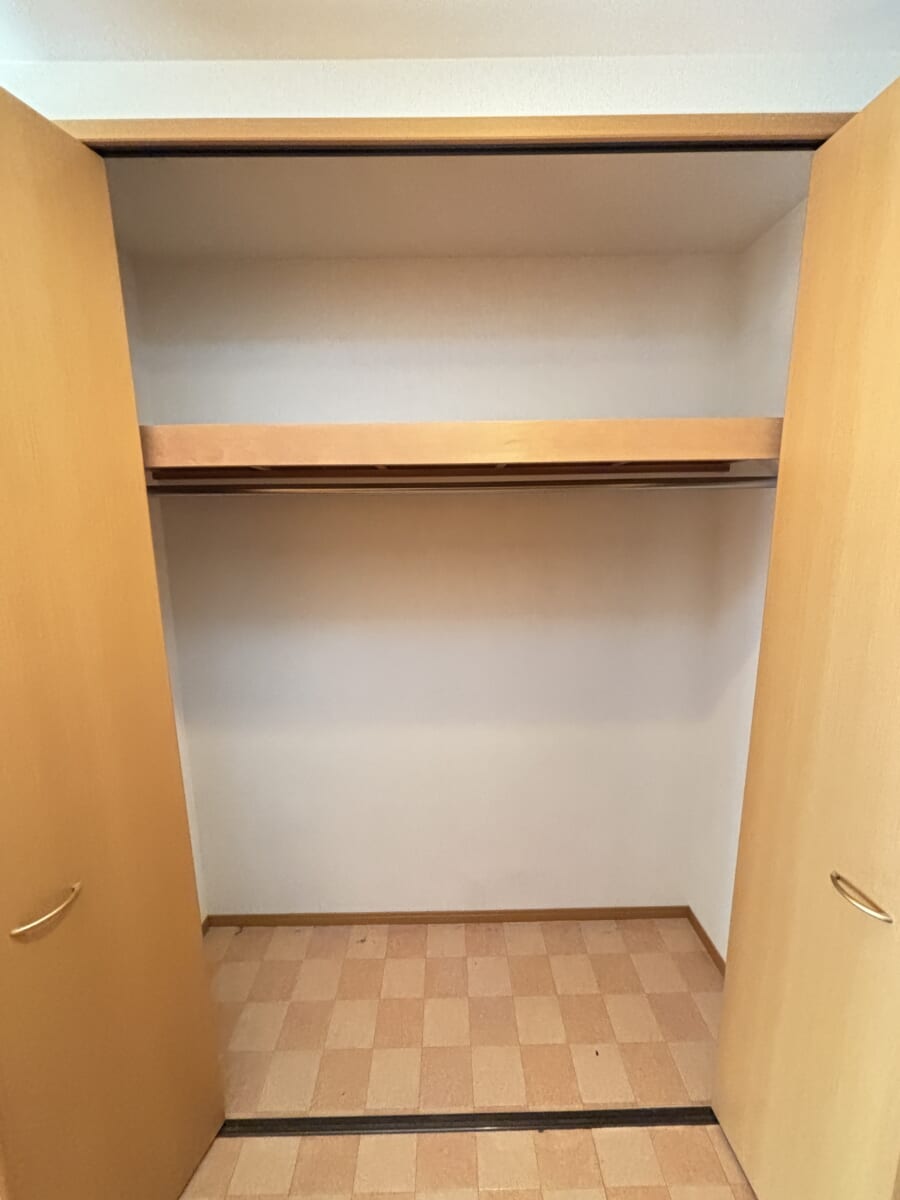 洋室には、衣類から季節物までたっぷりと収まるクローゼットを完備。ハンガーパイプ付きなので、お気に入りのコートやワンピースもシワにならずに大切に保管できます。上下の棚を活用すれば、バッグや帽子、スーツケースといったかさばるアイテムもスッキリと片付き、居住スペースを常に広々と保つことが可能です。
