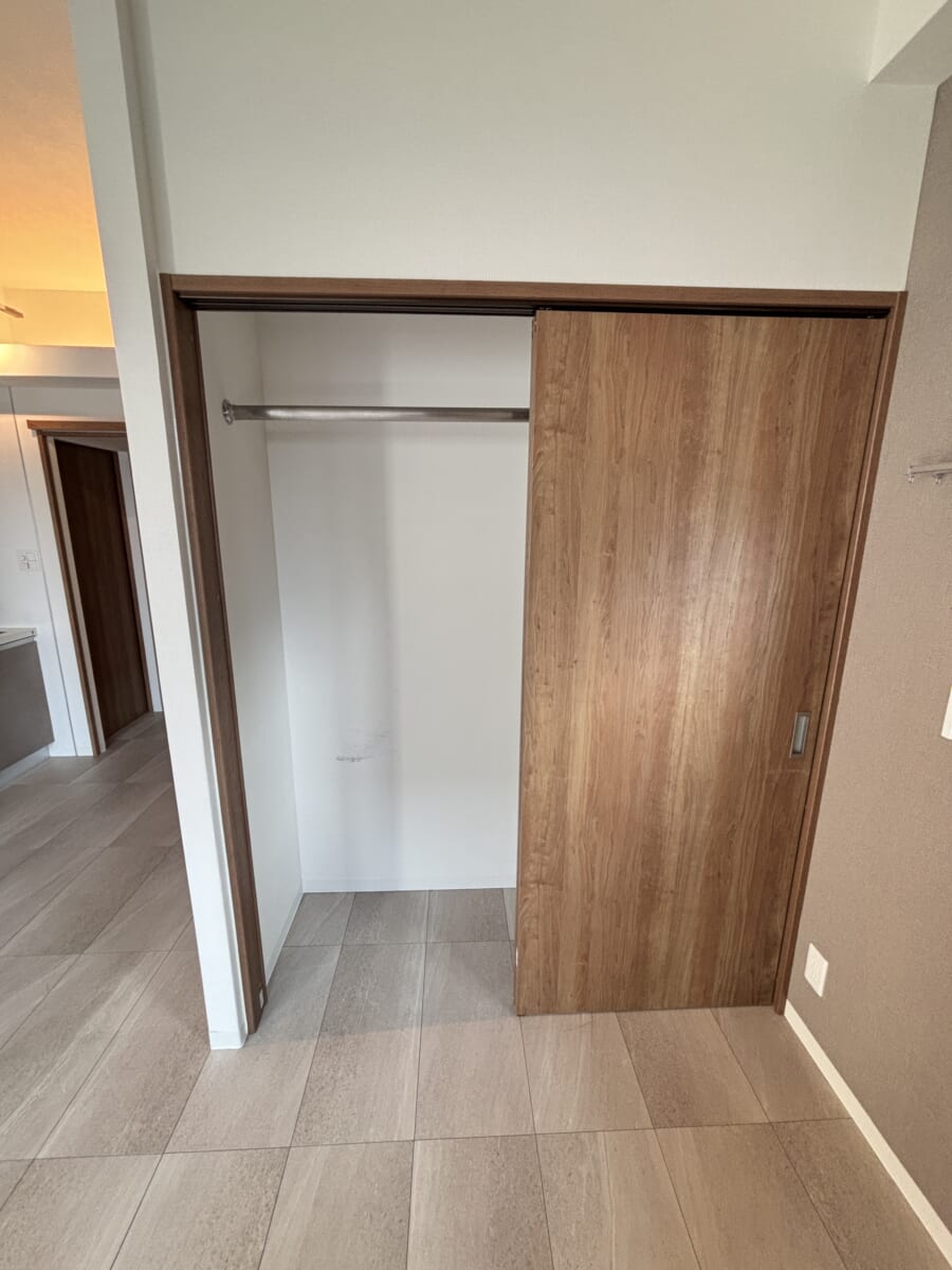 洋室には、天井近くまで高さのある大型のクローゼットが備え付けられています。内部にはハンガーパイプが設置されており、コートやワンピースなどの丈の長い衣類もシワにすることなく、たっぷりと収納可能です。上部の棚スペースは、普段使わない季節物やバッグなどの小物を整理するのに適しています。