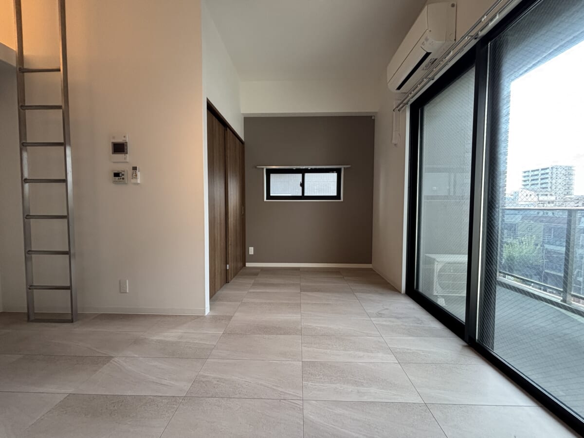 大きな掃き出し窓からは西向きの自然光が入り、日当たりも良好です。壁面には、丈の長い衣類もたっぷり収納できる大型のクローゼットが配置されており、生活感を隠して室内を広く使うことができます。また、エアコンが既設されているため、入居当日から快適な温度で過ごせるのも嬉しいポイント。
