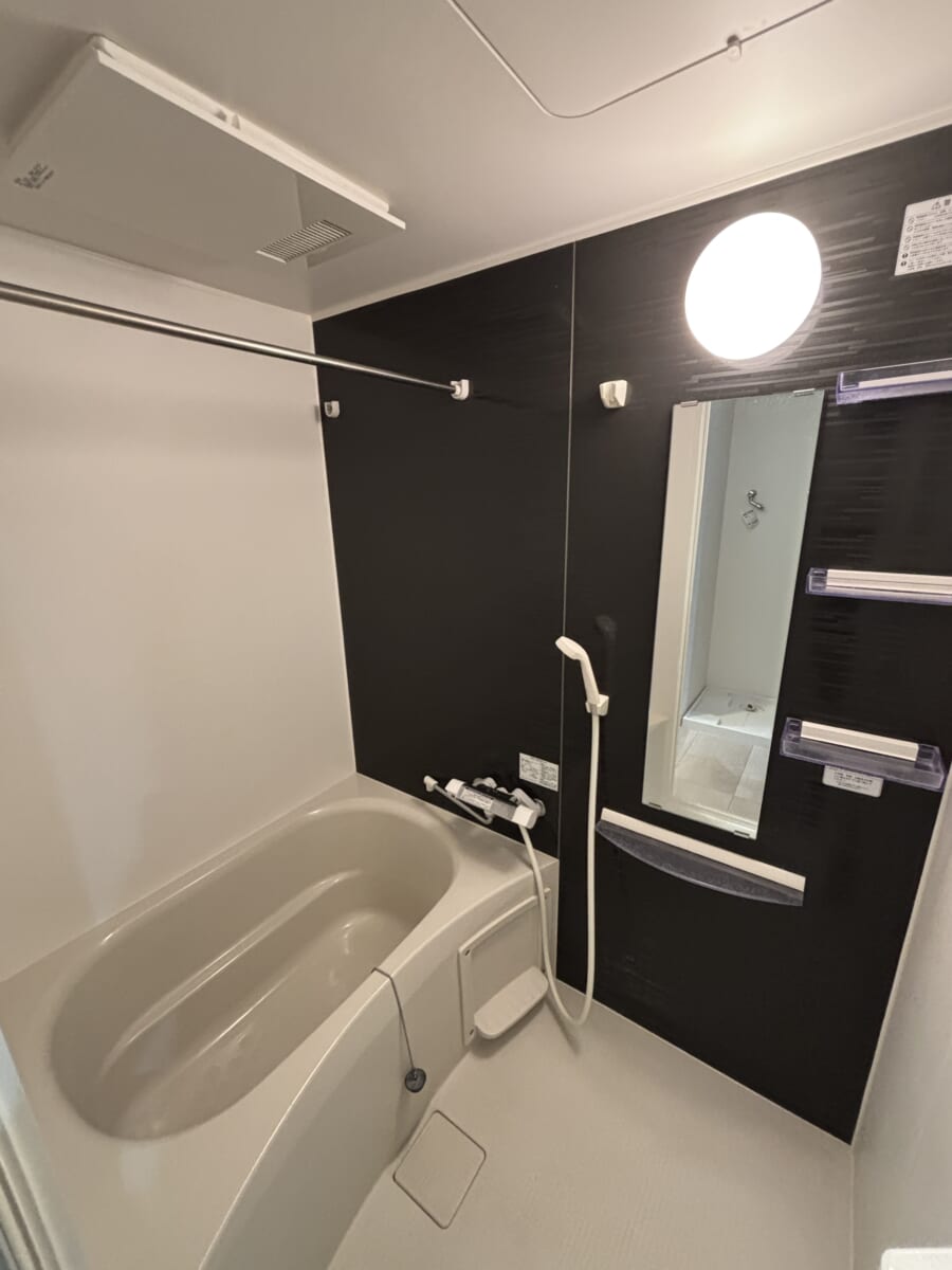 設備面での最大のメリットは、浴室換気乾燥機が備わっている点です。入浴後の湿気取りはもちろん、冬場の暖房機能や、外に干しにくい衣類の乾燥スペースとしても活躍します。また、浴槽横の壁面には操作パネルが設置されており、お湯の温度調節が手元でスムーズに行える仕様です。