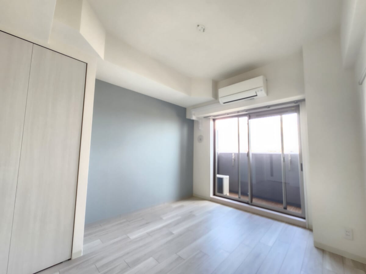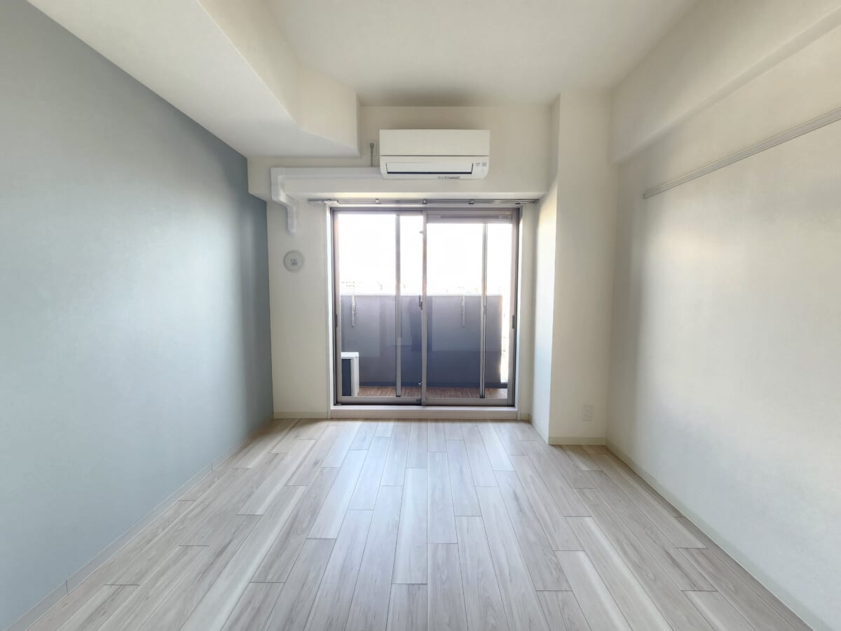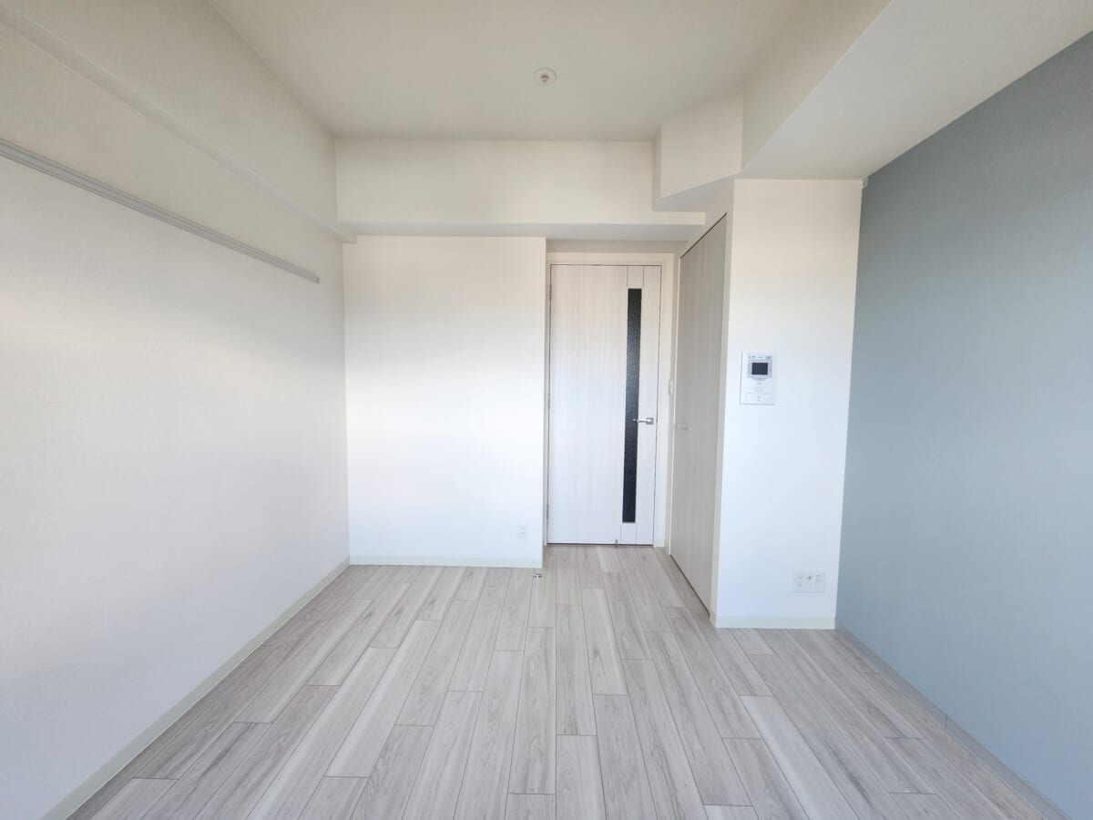 広さは約6.5帖から7帖前後と、シングルライフに程よいサイズ感。最上階かつ東向きの窓からは遮るもののない明るい光が差し込み、日中の開放感は格別です。フローリングや壁紙は清潔感のあるデザインで、どんなインテリアにも馴染みやすいのが特徴。