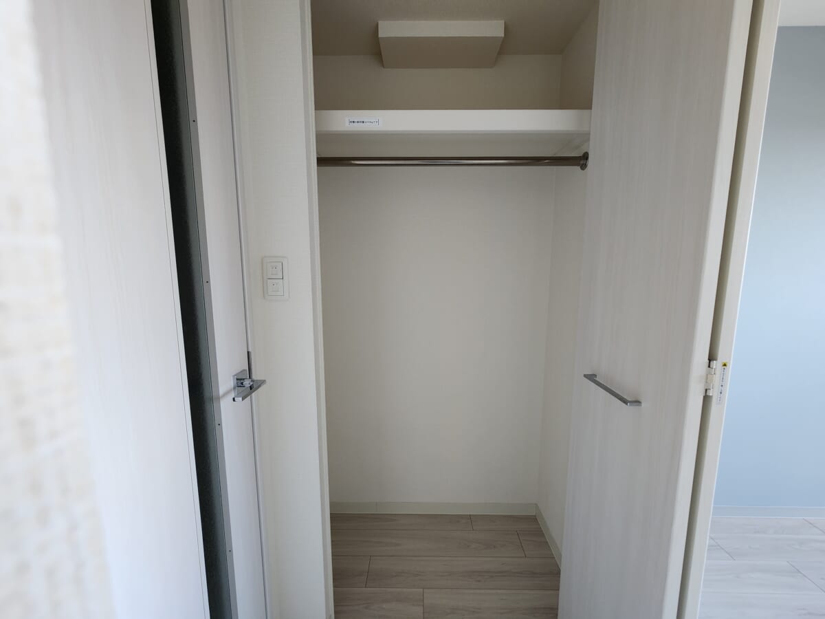居室にあるクローゼットは、ハンガーパイプが設置された縦に長いタイプ。コートやスーツなどの衣類をシワにせず掛けられるほか、上部の棚には普段使わないシーズンオフの荷物やバッグなどを分けて保管できます。扉は全開にできる形状のため、中の荷物が一目で把握でき、取り出しもスムーズです。