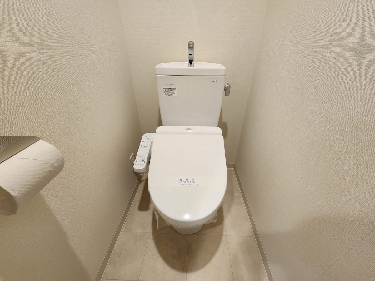 温水洗浄便座が標準装備されており、毎日を清潔で快適に過ごせるスペックが整っています。上部にはトイレットペーパーのストックや掃除用品を置くのに便利な収納棚が設けられており、限られたスペースを有効に活用。床面や壁紙も落ち着いたトーンでまとめられ、狭さを感じさせない機能的な個室空間となっています。