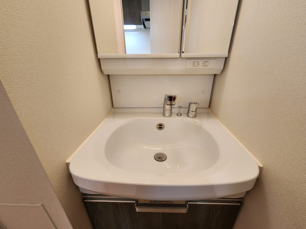 最大のメリットは、シングル向けの間取りながら「独立洗面台」がしっかりと確保されている点です。洗面台はシンプルで無駄のないデザインで、鏡まわりの収納を活用すれば、散らかりがちな洗面道具や化粧品もすっきりと整理できます。そのすぐ隣には洗濯機置き場が並んで配置されており、脱衣から洗濯までをその場で完結できるスムーズな動線が整っています。