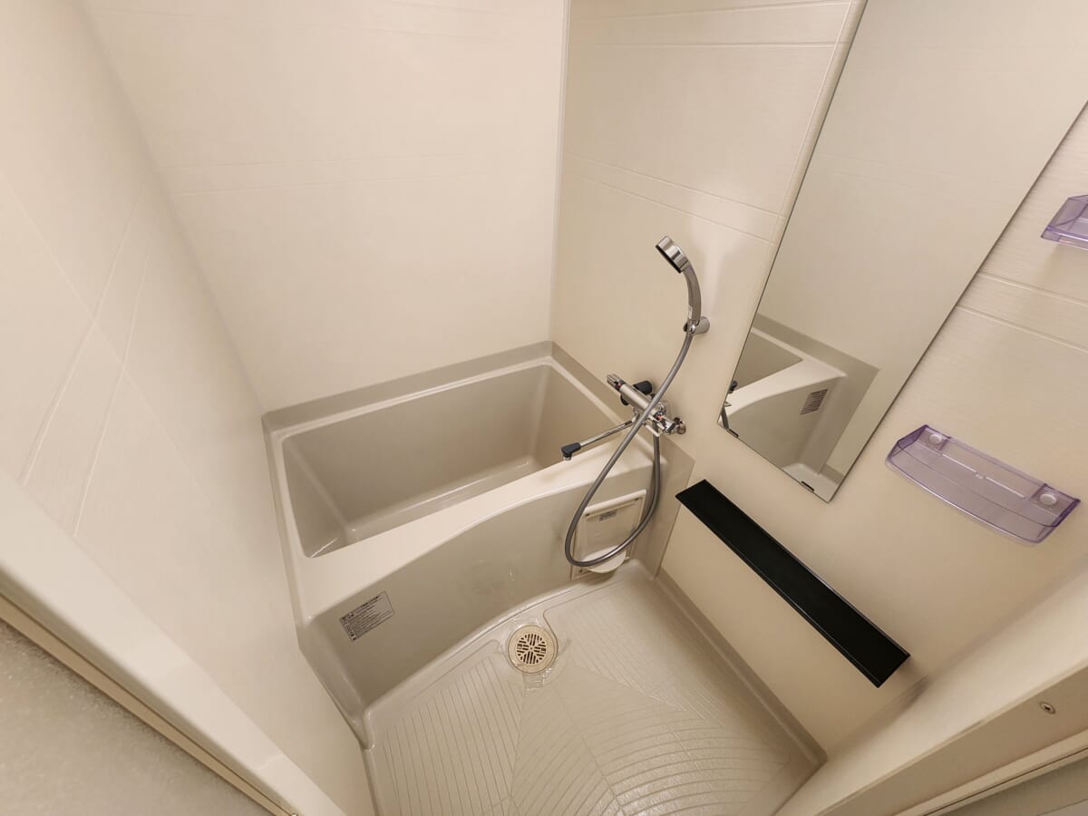 浴室内のデザインは、白を基調とした明るく開放感のある仕上がり。鏡や備え付けの棚も設置されており、シャンプーなどのバスグッズをすっきりと整理できます。最新の多機能設備を詰め込むよりも、日々の手入れのしやすさや、使い勝手の良さを追求した堅実な造りといえます。