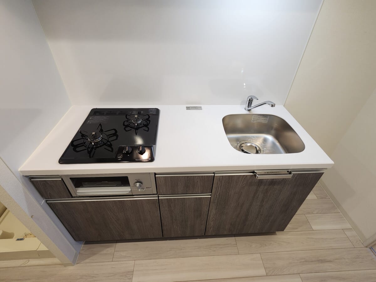 2口のガスコンロを搭載したシステムキッチンを採用しており、一人暮らしでも効率よく自炊を楽しめます。ホワイト調の明るいデザインは、限られた廊下スペースを視覚的に広く見せる効果があり、シンクや天板の手入れもしやすい素材感です。キッチン横には冷蔵庫専用のスペースが確保されており、居室への動線を妨げることなく、調理から片付けまでをスムーズに行える配置になっています。