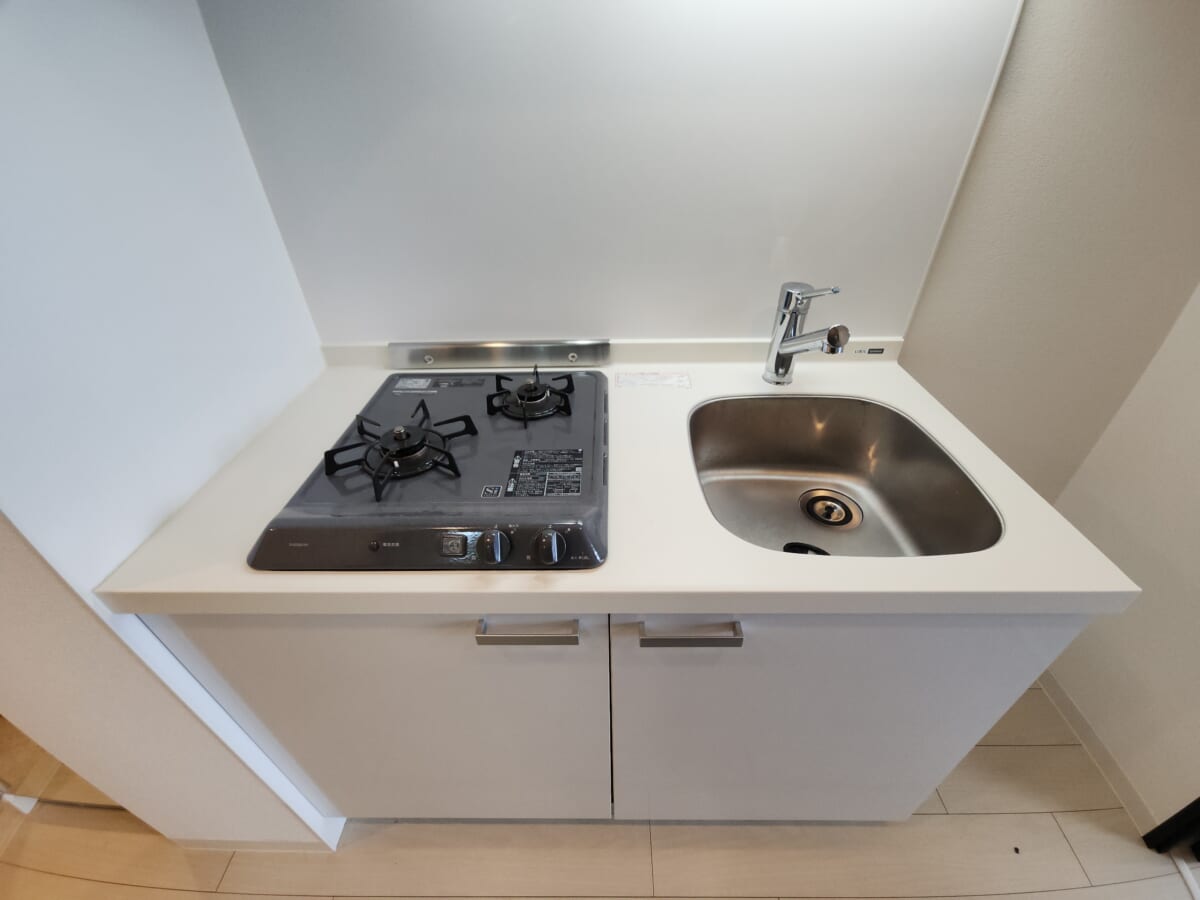 2口ガスコンロ完備 一人暮らし向けの物件では珍しい「2口コンロ」を搭載。片方でお湯を沸かしながら、もう片方でメイン料理を作るなど、効率よく調理ができます。自炊をしっかり楽しみたい方に嬉しいポイントです。