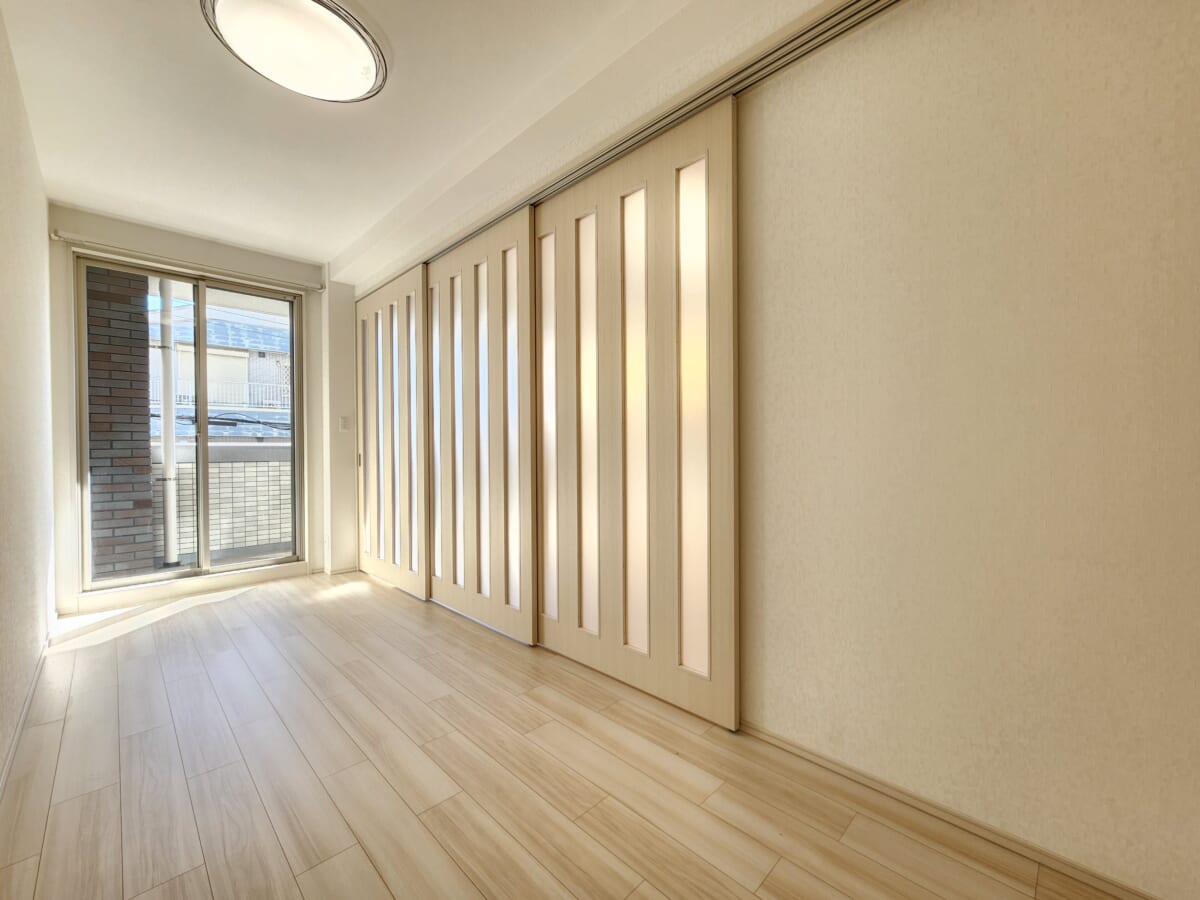 寝室: 6.45帖程度の洋室。クローゼットが設置されており、生活感を隠してスッキリ暮らせます。