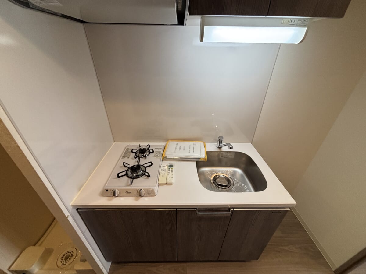 広さ: 1Kの間取りに合わせたコンパクトな設計ながら、シンクとコンロの間に調理スペースが確保されており、使いやすさが配慮されています。