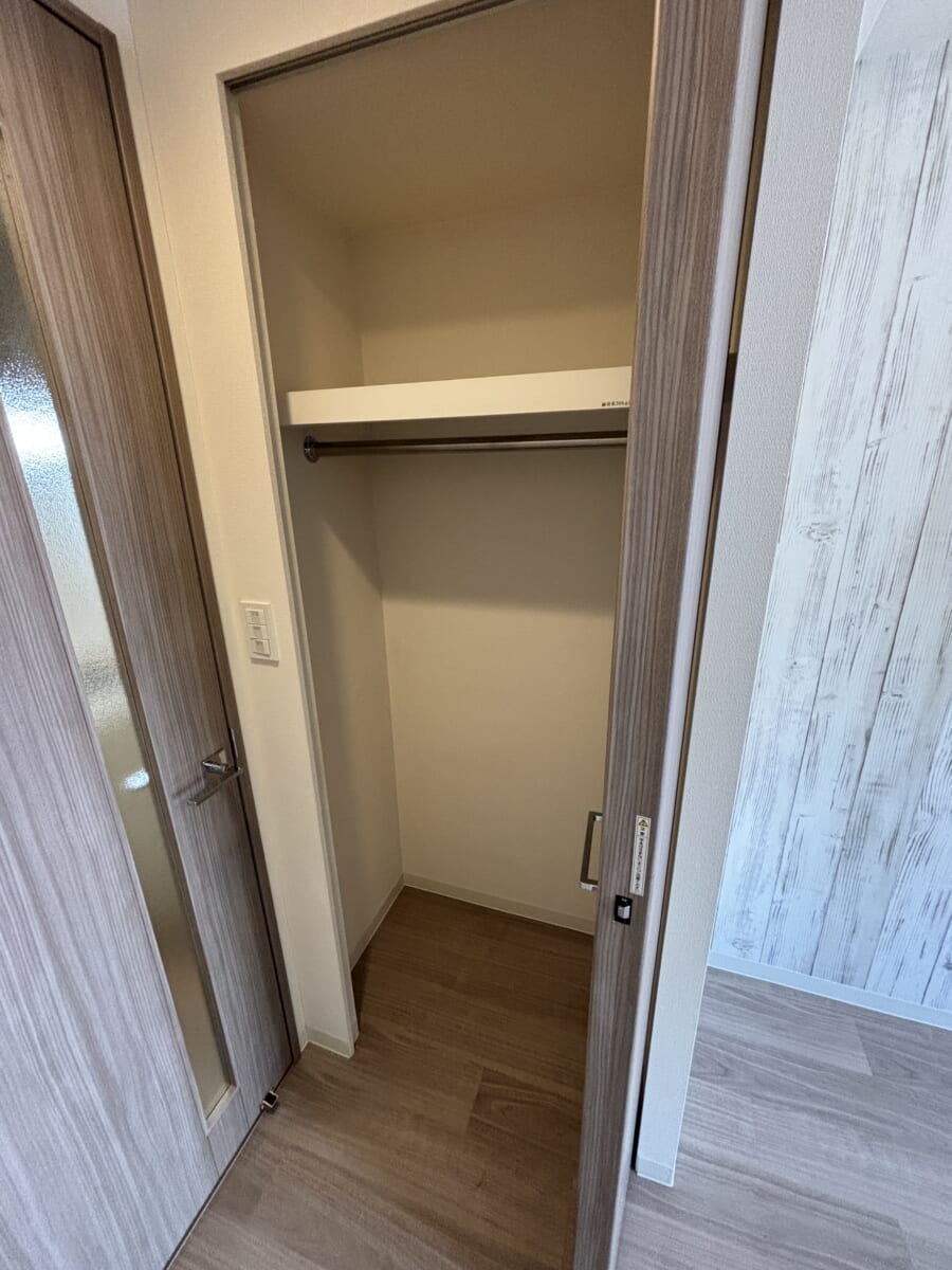 洋室のクローゼット 一人暮らしの衣類やカバンをまとめて管理できるクローゼットが完備されています。ハンガーパイプと上部の棚板がついているタイプが多く、丈の長いコートの収納と、箱物などの整理を両立できます。